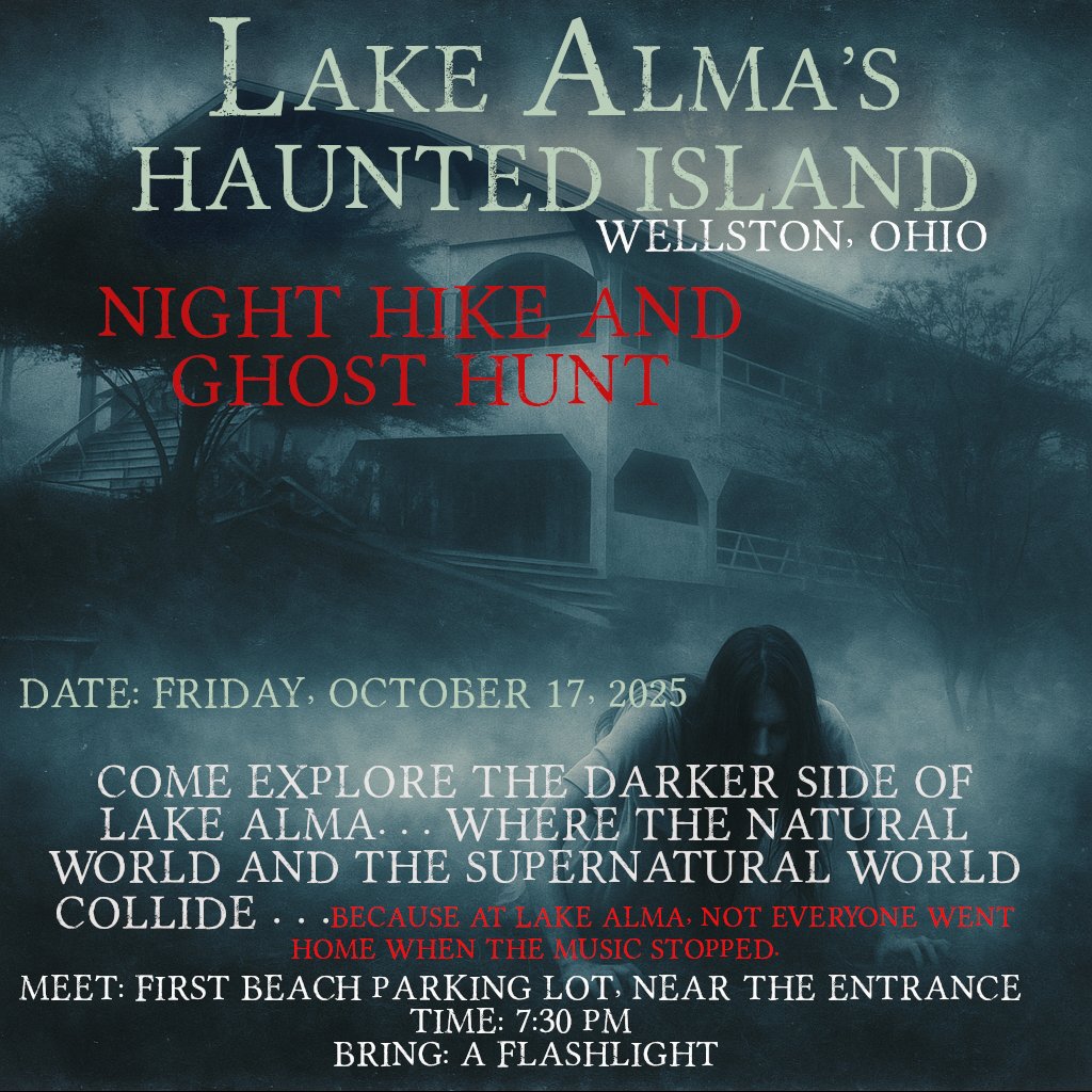 Join Friends of Lake Alma and Dark Journeys with Jannette for a guided night hike and hands-on paranormal investigation on the park’s haunted island. We’ll hike to the top and use the tools of the trade to explore Lake Alma’s darker side—where echoes of the old amusement park still linger in the trees and on the water. Jannette will be selling her books!